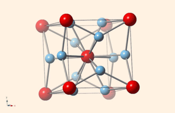 Immagine 1 - la struttura cristallina della lega metallica beta-Ti3Au (in blu gli atomi di titanio, in rosso quelli d'oro) - Credit: E. Morosan/Rice University