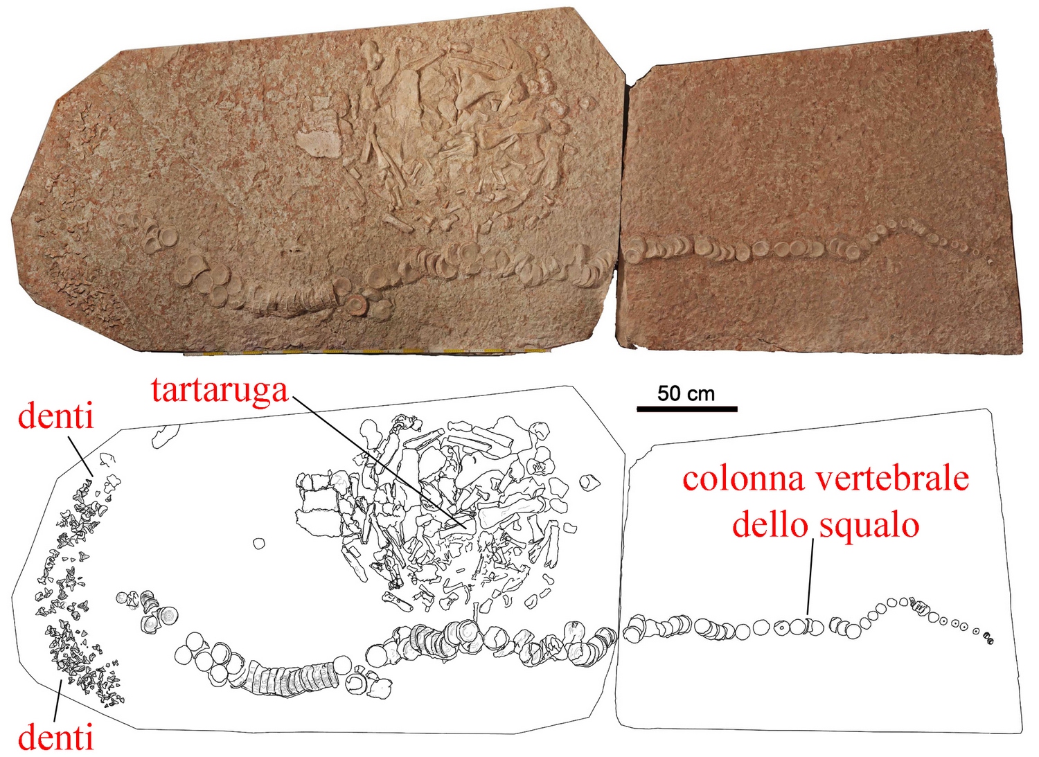«Lo squalo ha dilaniato la tartaruga, un rettile con una lunghezza totale capace di superare i due metri» dice Jacopo Amalfitano del Dipartimento di Geoscienze dell'Università di Padova «ne ha frantumato le ossa e un suo dente è rimasto inglobato tra esse. Dopo averla inghiottita è morto e si è depositato sul fondale prima di digerirla.
