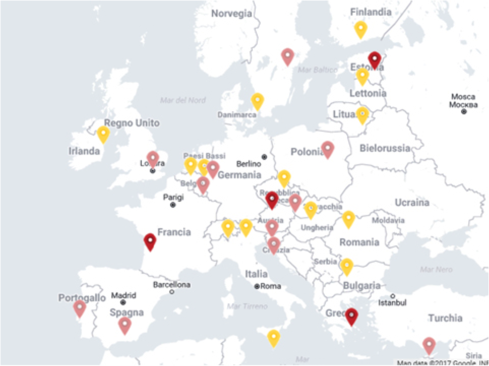 Nell’immagine sono contrassegnati i 29 paesi europei coinvolti nel progetto e che partecipano all’esposizione della mostra itinerante.