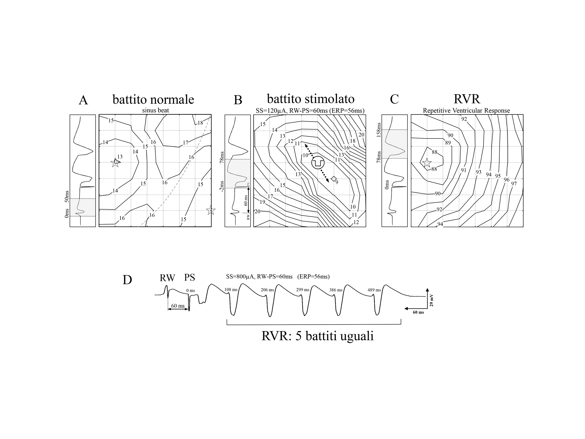 Mappe di linee isocrone dei tempi di attivazione (ms) misurati sulla superficie epicardica di cuore di ratto in vivo, durante A) battito normale, B) battito stimolato prematuro e C) risposta ventricolare ripetuta (RVR). La linea tratteggiata in A) rappresenta il setto interventricolare. Il punto di attivazione focale di RVR (C, stella) coincide con quello del battito normale (A, stella) ad indicare uguale modalità di attivazione del ventricolo destro per i due battiti. L’elettrogramma di riferimento, a sinistra in ogni mappa, rappresenta l’intervallo di tempo (ms) che comprende i tempi di attivazione ventricolare; RW, battito normale; PS, stimolo prematuro; SS, intensità dello stimolo; RW-PS, intervallo di accoppiamento; ERP, periodo refrattario effettivo.