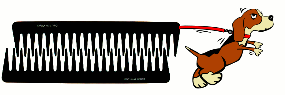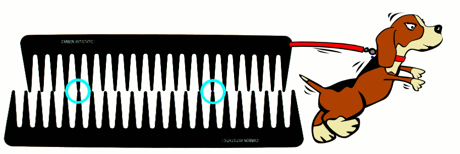 Figura 1. I denti dei due pettini rappresentano gli atomi della superficie. Chiaramente i denti (fig.1), che rappresentano gli atomi della superficie, si incastrano perfettamente, producendo un attrito enorme. Che succede invece quando le superfici sono diverse? Se la spaziatura tra gli atomi di una superficie è doppia rispetto all'altra (strappiamo via metà denti a un pettine), le cose non vanno meglio, come illustrato nella figura 2.
