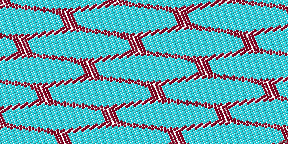 Figura 4. Rarefazioni di solitoni (vedere il colore rosso) nello strato di colloidi. I colloidi che formano i solitoni si “prendono per mano” aiutandosi a vicenda a superare le regioni oscure sfavorite dalla luce laser.