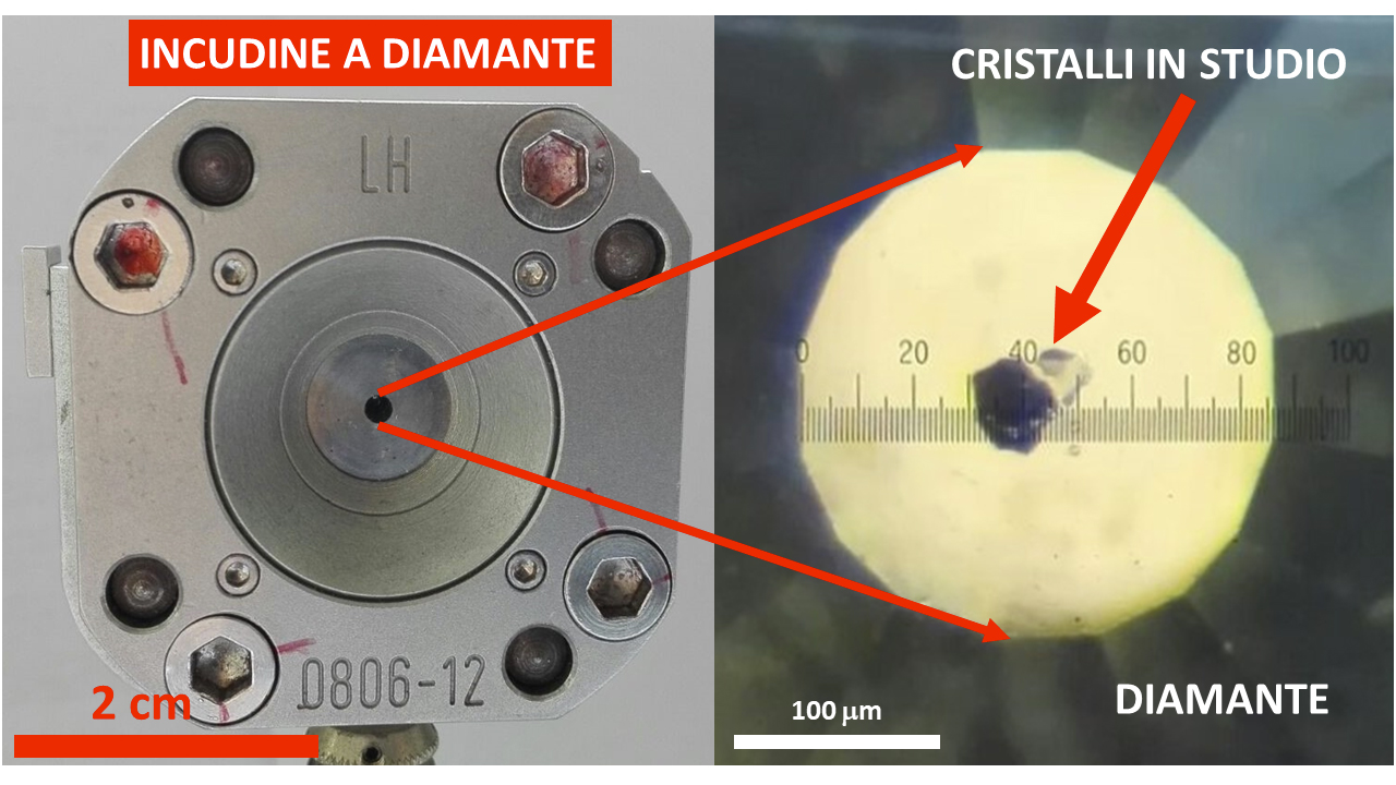 Foto 2 - Sulla sinistra è riportata la cosiddetta "incudine a diamante". L'incudine è uno strumento utile a riprodurre in laboratorio le enormi pressioni presenti all'interno della Terra grazie a due diamanti contrapposti e situati all'interno dell'incudine. Nel foro scuro centrale indicato con due frecce rosse si ha l'accesso ottico e l'accesso ai raggi X che attraversando quel foro colpiscono i cristalli in studio (visibili nella Figura di destra) e dopo averli attraversati vengono raccolti da un rilevatore. Quando i raggi X colpiscono i cristalli si verifica un fenomeno chiamato "diffrazione a raggi X" e tale fenomeno ci permette di comprendere la posizione degli atomi all'interno della materia. Grazie all'incudine a diamante possiamo aumentare la pressione a nostro piacimento, questo causa uno spostamento degli atomi all'interno della materia (tale spostamento e' alla base di qualsiasi proprietà della materia) che noi possiamo monitorare attraverso i raggi X proprio quando il cristallo è sotto pressione. Grazie a tale tecnica possiamo quindi comprendere come si comporta la materia quando è nelle condizioni di pressione presenti all'interno della Terra. Credits: Fabrizio Nestola