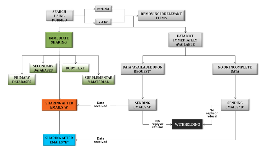 Dopo aver rimosso gli studi non rilevanti (ad esempio studi non pertinenti alle popolazioni umane, recensioni o meta-analisi), per un totale di 253 sul DNA mitocondriale e 290 del cromosoma Y, il dataset finale è risultato essere composto da 508 lavori pubblicati in 101 riviste diverse (vedi tabella S1 e Tabella S2 del lavoro originale: http://www.plosone.org/article/info%3Adoi%2F10.1371%2Fjournal.pone.0037552).
